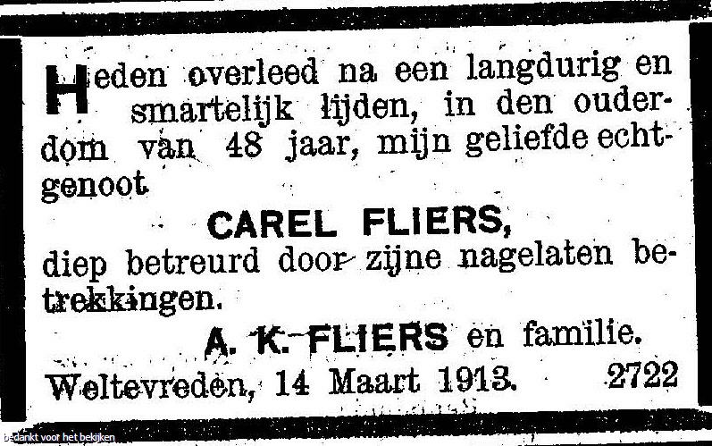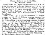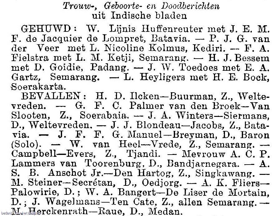 tr. (27 jaar oud) [98] (Burgerlijke Stand) te Batavia (Ind) op 23 apr 1891 met Adriana Katharina Palawisi [224] (Ambonesche Christenvrouw), ovl. te Amsterdam op 27 sep 1961,(naam in de krant iets anders beschreven!.)