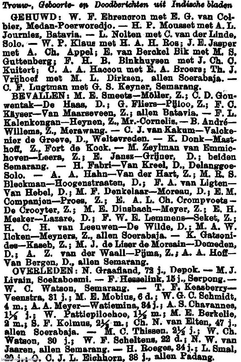 tr. (resp. 28 en 24 jaar oud) [42] (Burgerlijke Stand) te Semarang (Ind) op 25 apr 1891 met Geertruida Pijloo [106], dr. van Johannes Bernardus Pijloo [237] (Gezagvoerder (O.I.L. ?)) en Petronella Gijsberts van Loo [238], geb. te Panaroekan (Ind) op 7 sep 1866, ovl. (ongeveer 69 jaar oud) te Medan (Ind) in 1936.