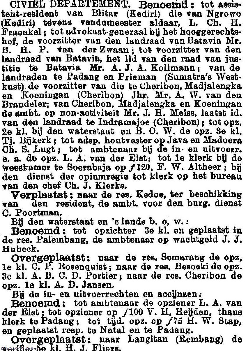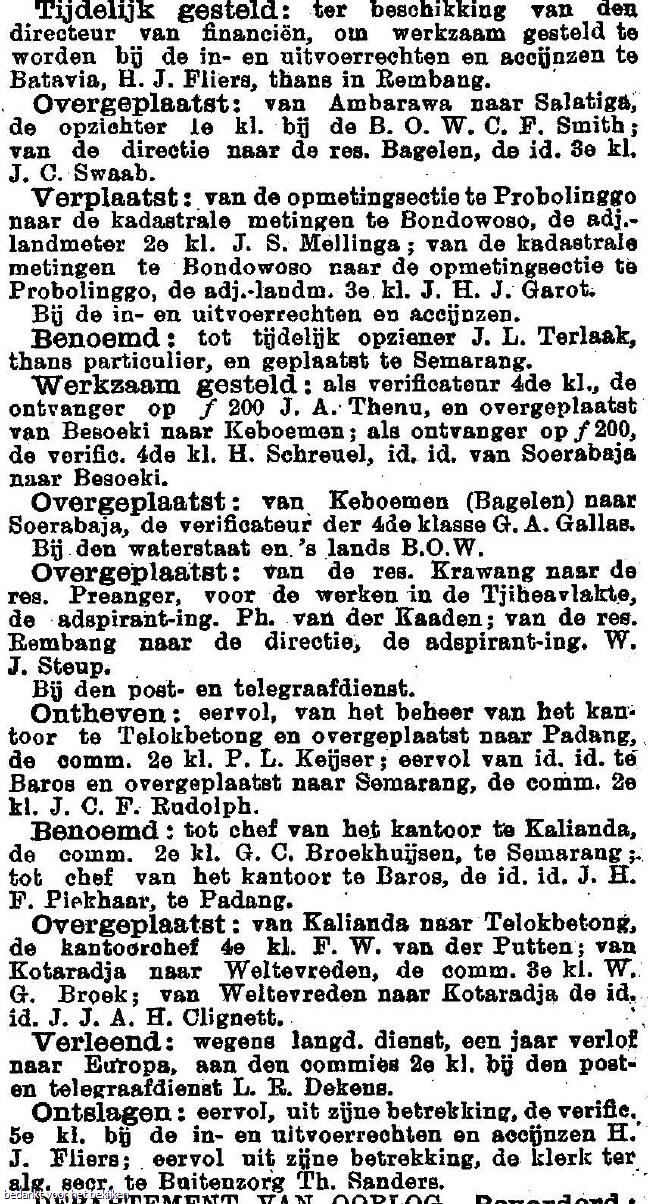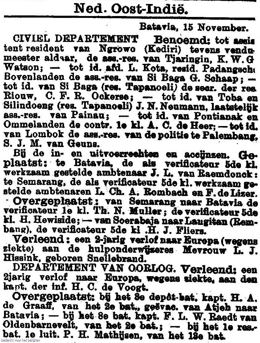 zn. van(VIIb) , geb. te Amboina (Ind) op 29 nov 1872, Ontvanger/verificateur, ovl. (67 jaar oud) te Bandoeng (Ind) op 14 dec 1939, 4 tr. (resp. 29 en 24 jaar oud) [100] (Burgerlijke Stand) te Telok Betong (Ind) op 2 okt 1902 met Alida Clara Neumann [230], geb. te Banjoewangi (Ind) op 27 jun 1878, ovl. (86 jaar oud) te 's Gravenhage op 3 aug 1964.